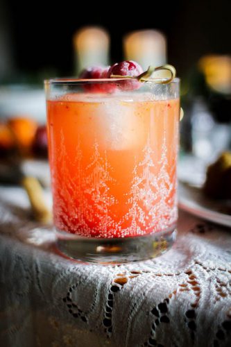 - Fill a shaker 3/4 full with ice and then add the rum, cranberry juice, and clove syrup (instructions below).