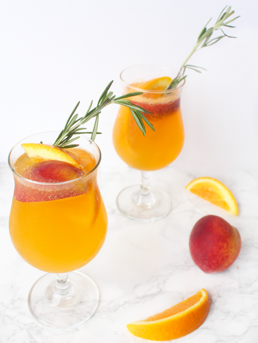 - Serve the sparkling peach punch in a chilled glass and garnish with fresh rosemary.