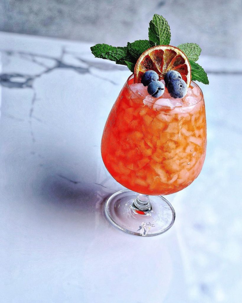 Pour over ice and garnish with dried orange and frozen blueberries.