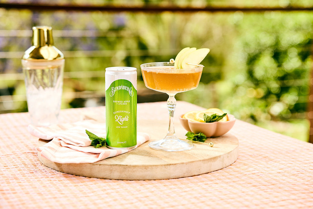 Pour into a martini glass and top with Refreshingly Light Apple + Lychee.