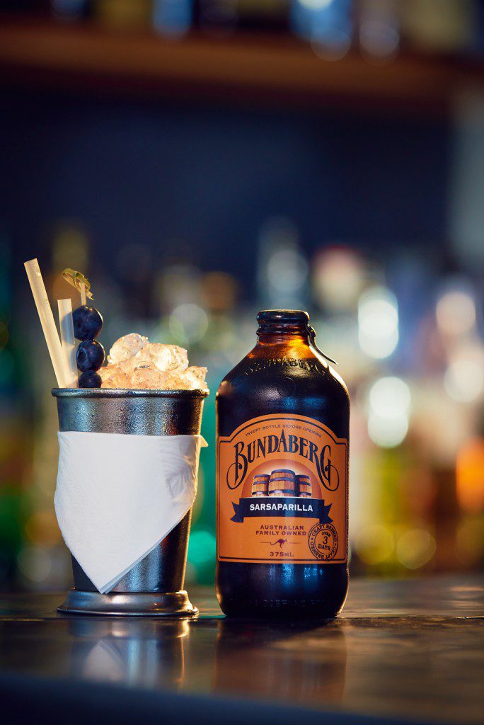 Top with Bundaberg Sarsaparilla. Garnish with blueberries on a toothpick.