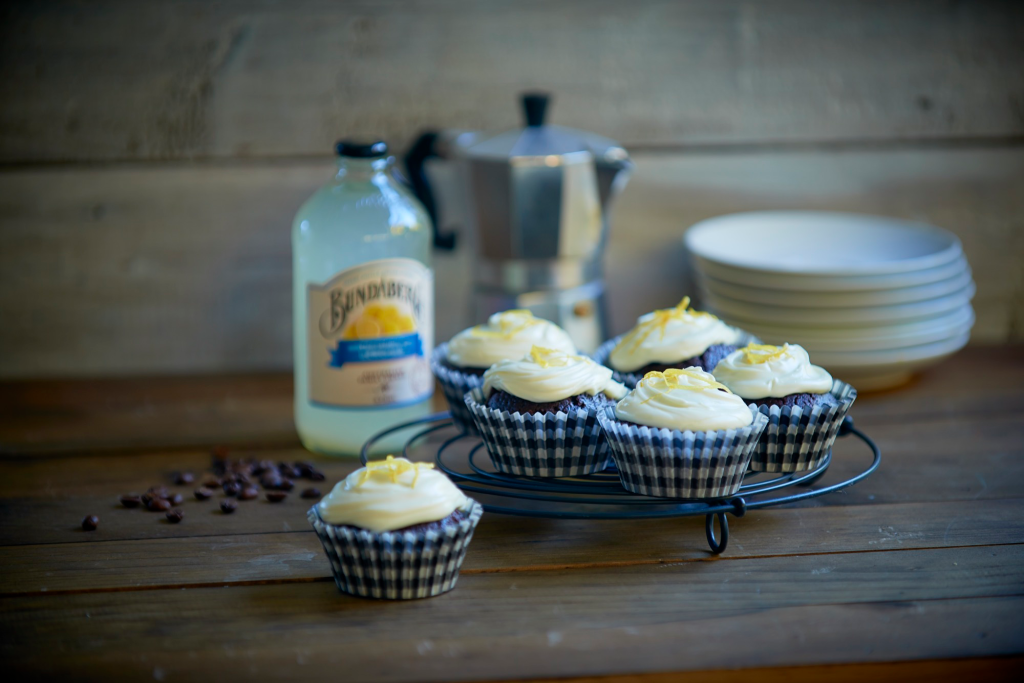 In a mixer, beat the packet chocolate cake mix, 1 cup of Bundaberg Brewed Sparkling Lemonade, eggs and melted butter until smooth. Prepare a cupcake tin with paper sleeves and pour enough mixture to ¾ fill each sleeve.