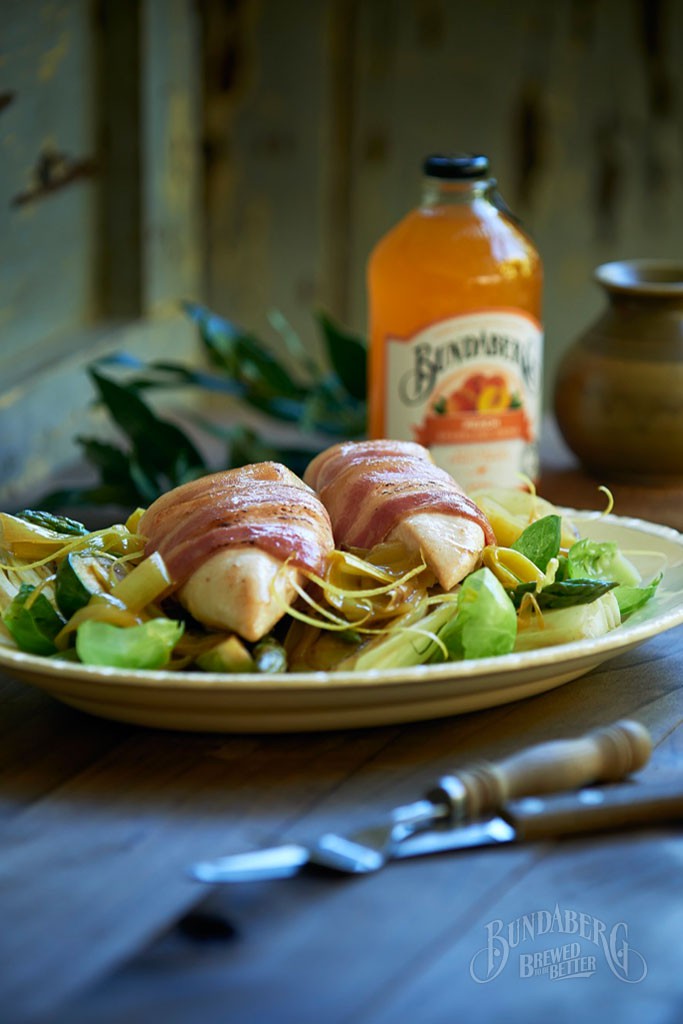 Wrap each chicken breast with a rasher of bacon and secure with toothpicks. Add a couple of tablespoons of olive oil to a large frying pan on high heat and seal the chicken breasts on all sides and remove from the pan. Turn the heat to low and add the butter and the sliced leeks and braise for 5 minutes, stirring often, until leeks have softened. Do not allow to the leeks to colour/burn.